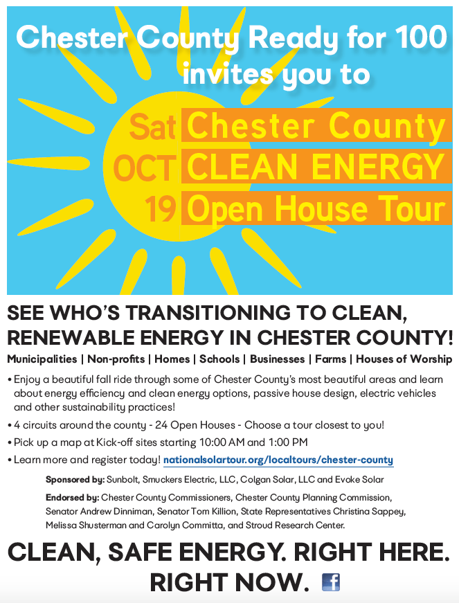 The tour is coordinated by Solar United Neighbors and the American Solar Energy Society, with help from Chester County Ready for 100% Renewable. See more about the nationwide National Solar tour here.