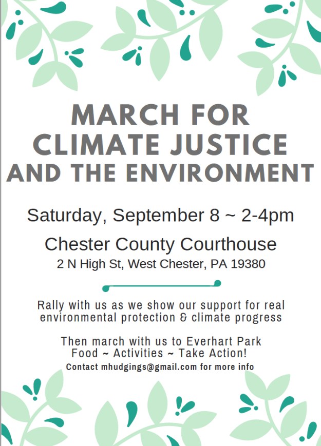 Please join us for the Chester County March for Climate Justice and Environment on Sept 8, 2018, rallying at 2 p.m. at the Chester County Court House in West Chester, marching a few blocks at 3 p.m., and reconvening at Everhart Park.