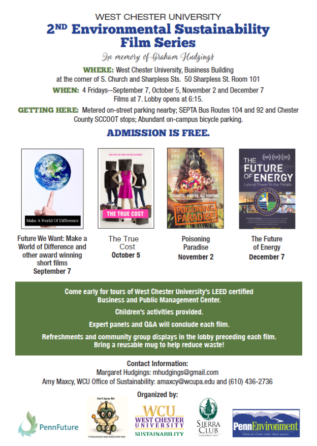 “The Future of Energy,” about clean energy. Sponsored by West Chester University, Sierra Club, PennFuture, PennEnvironment, and Don’t Spray Me!